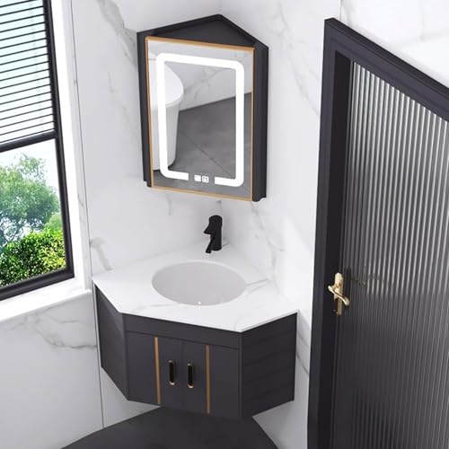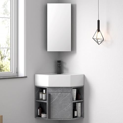 GUAWJRZDP Bathroom Sink, Corner Ceramic Sink, Corner Bathroom Vanity, Wall Mounted Bathroom Sink, Corner Sink with Mirror Cabinet, Modern Bathroom Storage Cabinet, for Small Space(Grey)