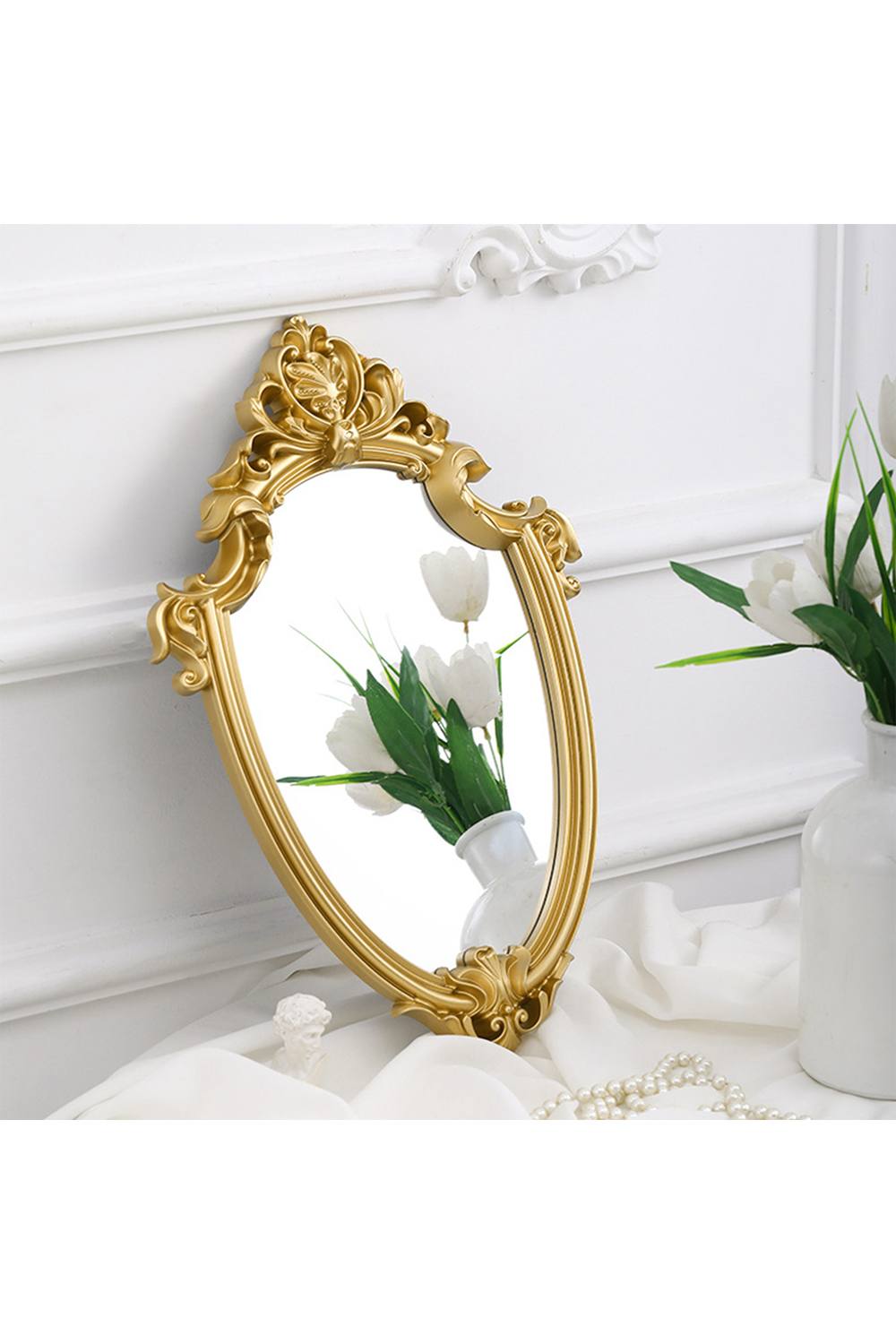 Living and Home Luxury Gold Shield Shape PP Frame Carved Decorative Wall Mirror for Dressing Table Living Room Bathroom