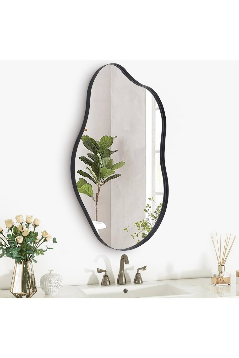 Living and Home Black Asymmetrical Art Deco Wall Mirror Irregular Metal Frame Makeup Mirror for Living Room Bedroom Bathroom, 50cm W x 85cm H