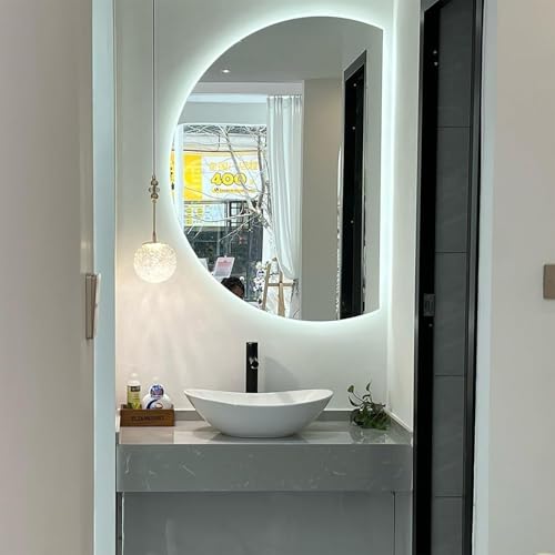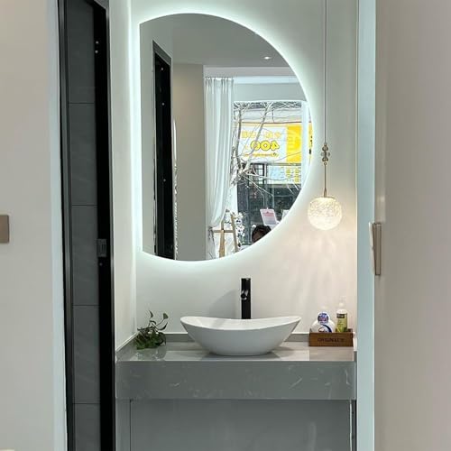 XIAKUS Smart Luminous Bathroom Mirror, Wall-Mounted Makeup Mirror with LED Light, Defog, Dimmable, Half-moon/Semicircular Frameless Hallway Mirror(Right Cut,35.4"x23.6")