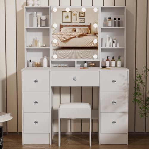 Vanity Desk,Vanity Makeup Desk with Sliding Lighted Mirror,Vanity Mirror Makeup Desk with Cushion Stool, 4/6 Drawers and Shelves & 3 Adjustable Lighted for Bedroom & Bathroom UK Fast Arrive Six Drawe