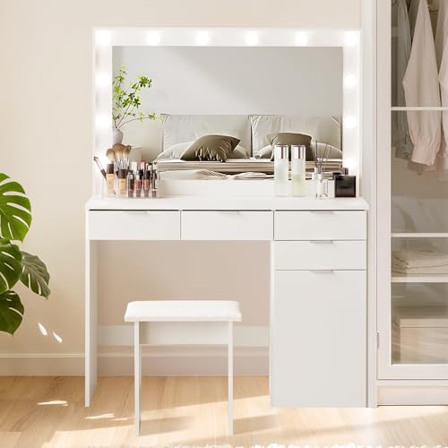 LIANWANG White Vanity Set, Hollywood Vanity Desk with Mirror and Lights, Dressing Table with 4 Drawers and 6 Cabinets, Small Makeup Table with Stool for Teen Girls