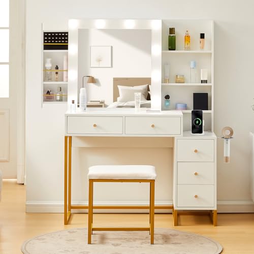 Koestem White Dressing Table Set with Hollywood LED Lights Mirror, 39.4" W Make Up Vanity with Hidden Storage Shelves and 6 Open Shelves, White for Bedroom with 7 Drawers