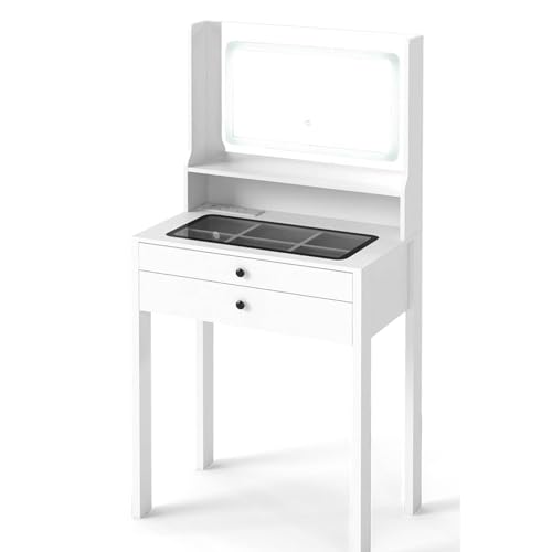 Dyqyym Vanity Table with Mirror & Lights Makeup Dressing Table with Storage Drawers & Compartments Includes Stool for Bedroom & Bathroom White 23.6"x16.5"x30" (Blanc 23.6 x 16.5 x 30.7in)