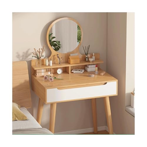 JUSKAQZYI dressing table Makeup Vanity Desk with Round Mirror and Lights Small Dressing Table for Bedroom with Lots Storage Oak 31inch vanity table(Oak,Single)