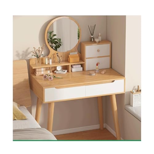 JUSKAQZYI dressing table Makeup Vanity Desk with Round Mirror and Lights Small Dressing Table for Bedroom with Lots Storage Oak 31inch vanity table(Oak,Double)