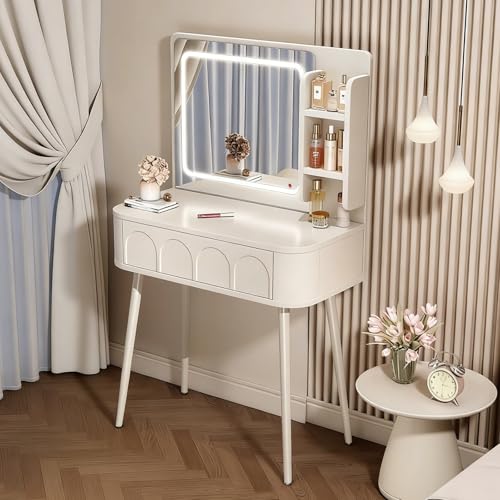 Dyqyym Vanity Table with Mirror & Lights Makeup Dressing Table with Storage Drawers & Compartments Includes Stool for Bedroom & Bathroom White 23.6"x16.5"x30" (Agray 80cm/31.5in)