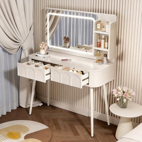 loyliawa Dressing Table, Vanity Desk with Sliding Mirror and Lights, Bedroom Dressing Tables, Makeup Table with Drawers & Shelves for Living Room Bedroom Girl Women (White 2.0)