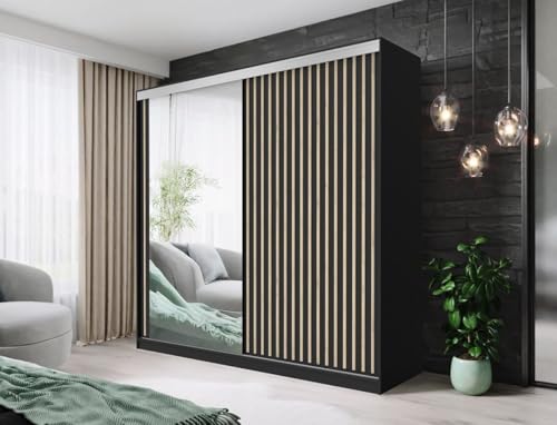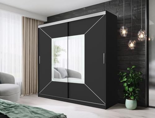 FHI_kingston Modern Mirrored Sliding Wardrobe with Shelves, Hanging Rails Bedroom Furniture available in White, Black Grey, Oak | Sizes: 150, 180, 203, 250cm (Black, 203)