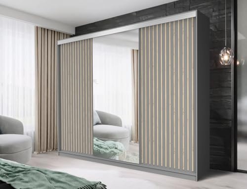 Arthauss Modern Bedroom Mirrored Sliding Door Wardrobe ARTI 1 in Grey 250cm - Flat Pack Mirrored Wardrobe with Hanging Rails and Spacious Drawers - Ideal for Compact Spaces