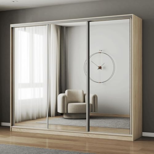 FHI-DUBAI Mirrored Sliding Door Wardrobe with Full Mirror | Modern Bedroom Storage | Multiple Sizes & Colours | Optional LED & Assembly (Oak, 250cm)
