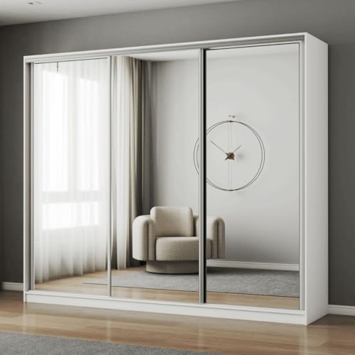 FHI-DUBAI Mirrored Sliding Door Wardrobe with Full Mirror | Modern Bedroom Storage | Multiple Sizes & Colours | Optional LED & Assembly (White, 250cm)