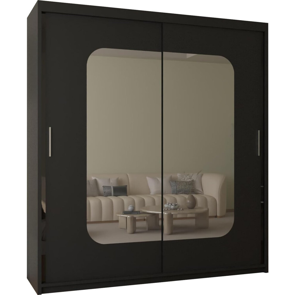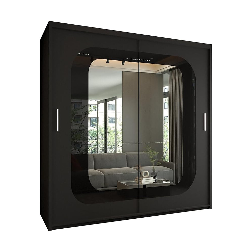 Lyon Modern Mirrored Sliding Door Wardrobe – Space Saving Bedroom Furniture with Mirror Doors, Shelves & Hanging Rails, Clothes Storage (Black, 203)
