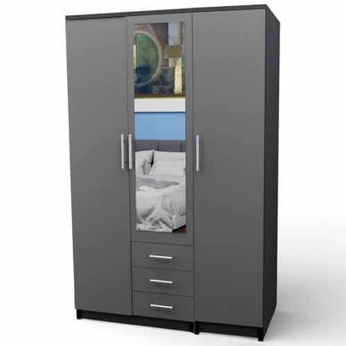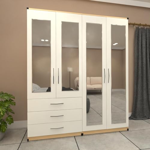 4 Door Mirrored Wardrobe with 3 Drawers, 2 Bedside Tables and Chest of Drawers, White (Grey & White)