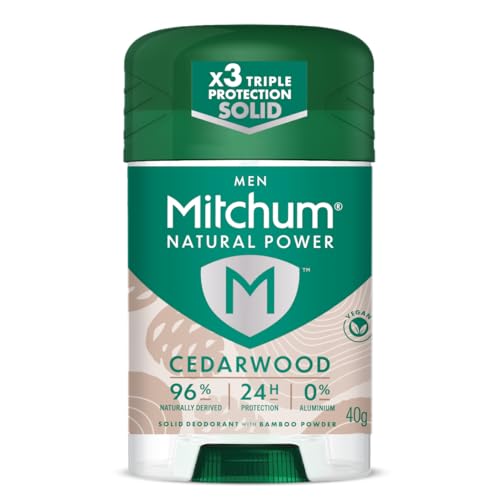 Mitchum Men 24HR Natural Vegan Deodorant Stick with 96% Ingredients (40g) Aluminium Free, Cedarwood Scent, Dermatologist Tested