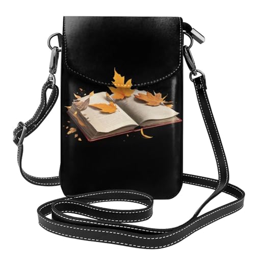 BROLEO Old books and scattered leaves printing Ladies' mobile phone with leather foreskin, crossbody flip cover, small adjustable shoulder strap
