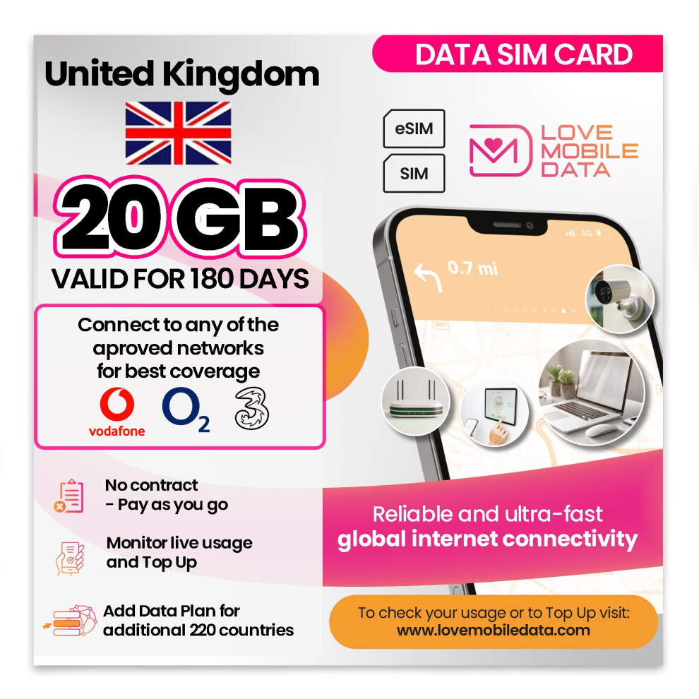 Love Mobile Data Only Sim Card - International Multi-Network 4G/5G Prepaid Pay As You Go Data Sim for Mobile Phones, WiFi Routers, United Kingdom (O2