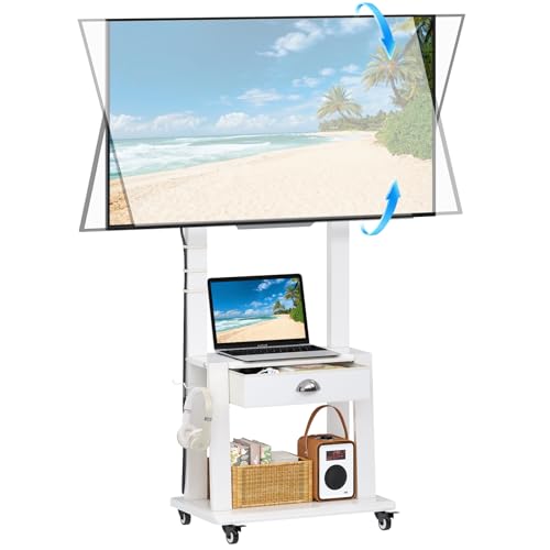 Mobile TV Stand with Drawer for 23-75 inch Flat/Curved Screen,Tilt Rolling TV Cart on Wheels with 2 Shelves,Adijustable Height TV Stand Holds up to 120lbs for Indoor Outdoor,Max VESA 600x400mm,White