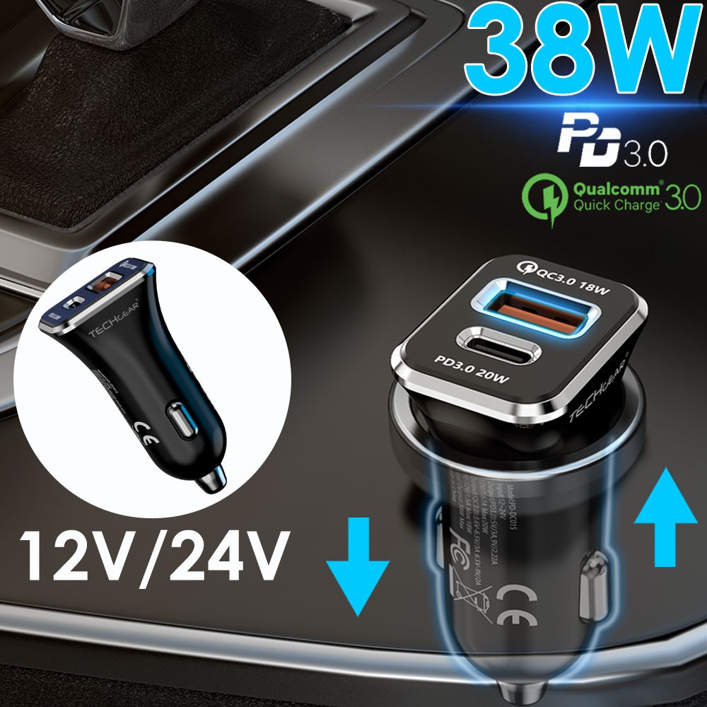 USB A & C Fast Car Charger 12V/24V 38W PD & QC 3.0 For iPhones iPads Mobiles