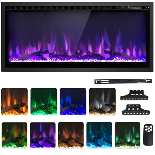 INMOZATA Electric Fire Wall Mounted Recessed Insert 40 50 60 inch Electric Fireplace with Touch Remote Control 9 LED Color Flame Effect Electric Fire Heater, Crystal and Log Set