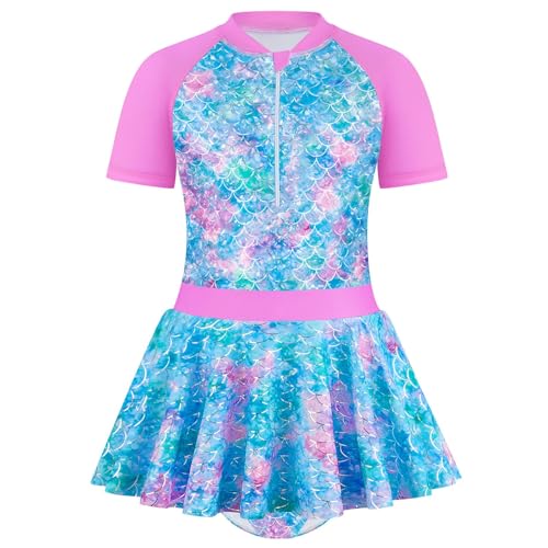 Hotfiary Girls Mermaid One Piece Swimsuits, Kids Short Sleeve Swim Dress with Zip Up Front, Youth Tween Girls Hawaiian Skirted Bathing Suit, Modest Summer Beach Swimwear 4 5 6 7 8 9 10 11 12 Years