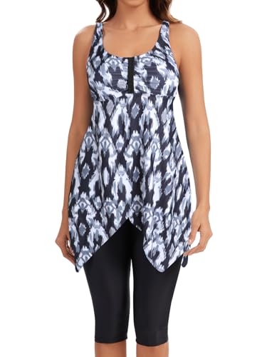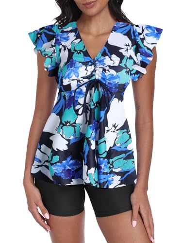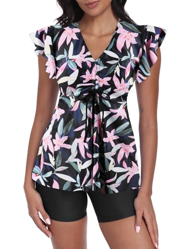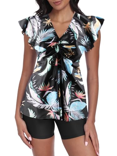 ECUPPER Womens Tankini Swim Dress with Sleeves Modest Two Piece Swimsuits Tummy Control Bathing Suit Floral Printed Swim Tops and Shorts Black 3XL