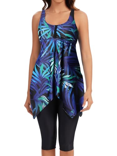 Yonique Tankini Swimsuits for Women 3 Piece Bathing Suits Swim Tank Top with Boy Shorts and Bra Modest Swimwear, Blue Leaf, Medium