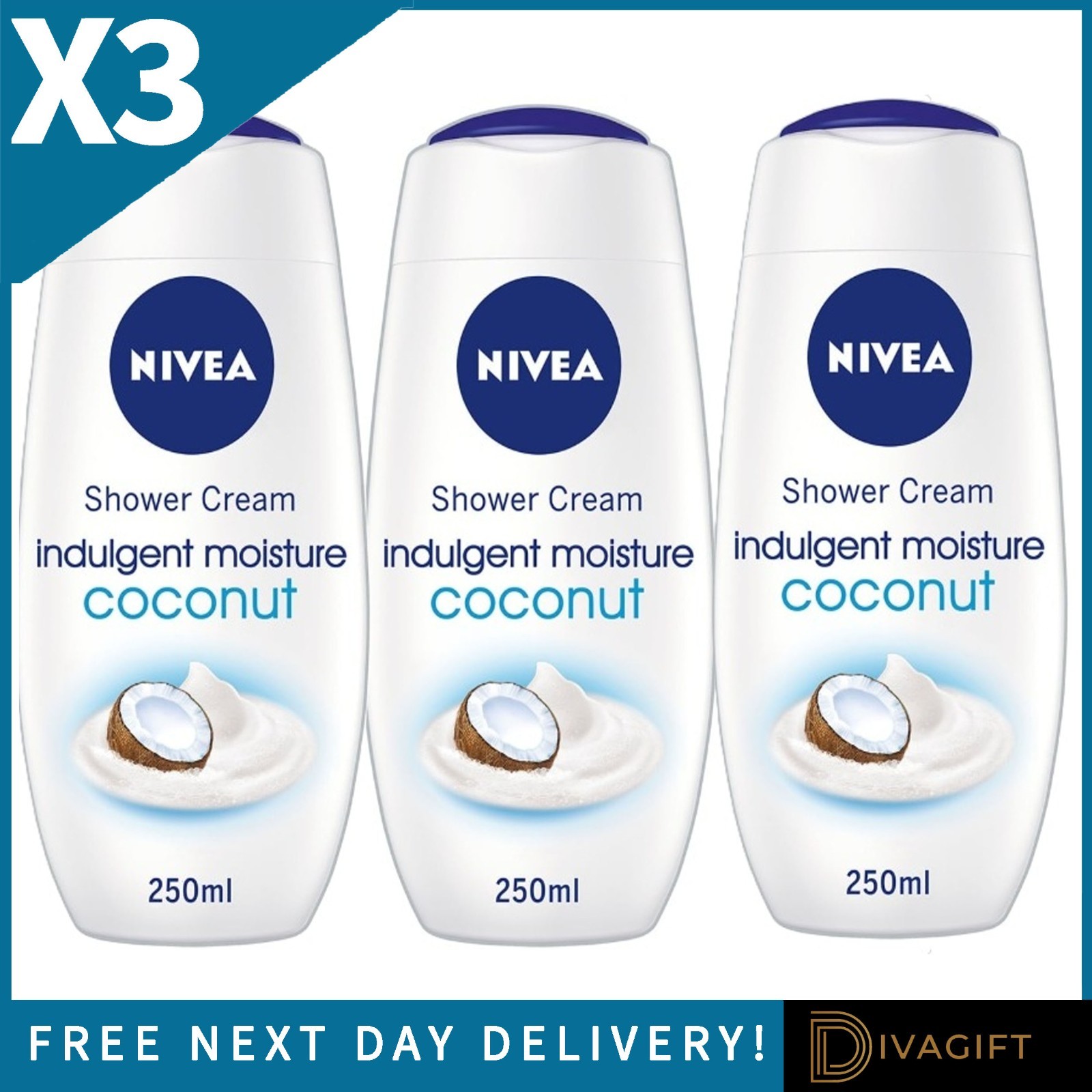 3 x NIVEA COCONUT SHOWER CREAM 250ML INDULGENT MOISTURISING BODY WASH MOISTURE