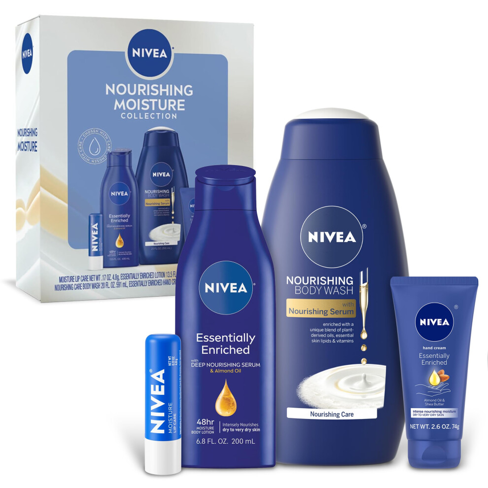 NIVEA Nourishing Moisture Collection Skin Care Set Nourishing Care Body Wash 20 Fl Oz Bottle + Body Lotion 13.5 Fl Oz Bottle + Hand Cream 2.6 Oz T