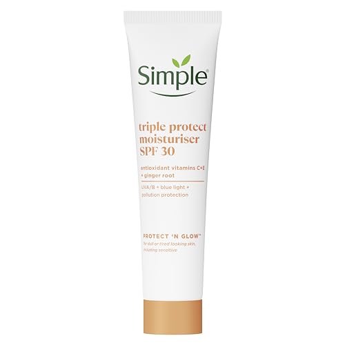 Simple Triple Protect Moisturiser SPF 30 – 3x Protection from UVA/UVB, Blue Light & Pollution with Vitamin C & E – Brightens Dull, Sensitive Skin for a Glowing Complexion 40 ml
