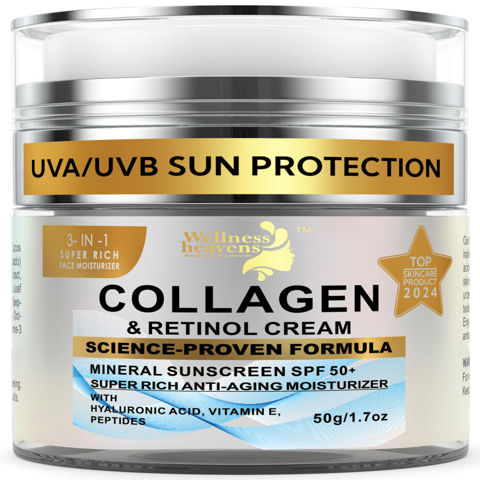 Face Cream with Collagen Retinol & Hyaluronic Acid-Face Moisturizer with SPF 50+ Mineral Sunscreen- Wrinkle Repair Anti Aging Moisturizing Cream