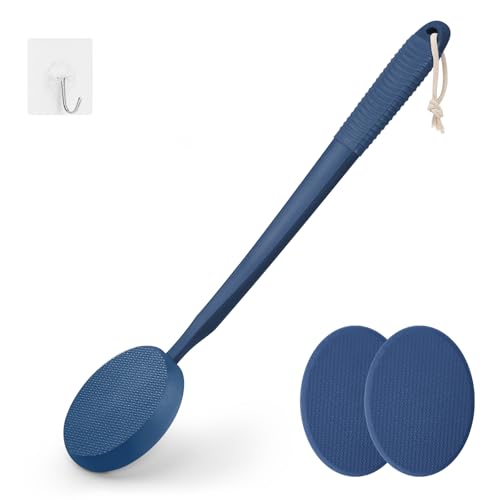 Lotion Applicator for Back, Feet & Legs with Long Plastic Handle, Back Moisturizer Cream, Self Tanning, Sunscreen, Ointment, Medicine Applicator for Elderly, Men or Women with 3 Washable Pads (Blue)
