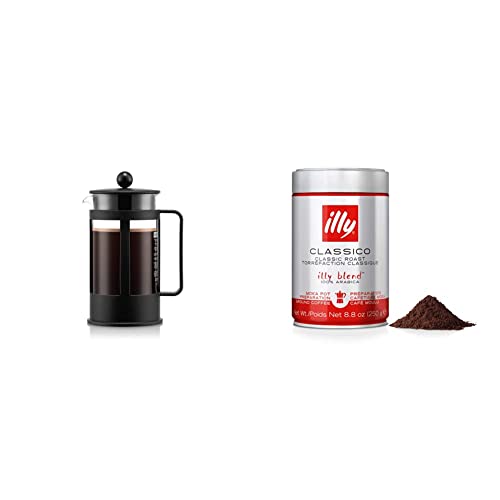BODUM Kenya 3 Cup French Press Coffee Maker, Black, 0.35 l, 12 oz & illy Coffee, Classico Ground Coffee for Moka Pots, Medium Roast, 100% Arabica Coffee Beans, 250g