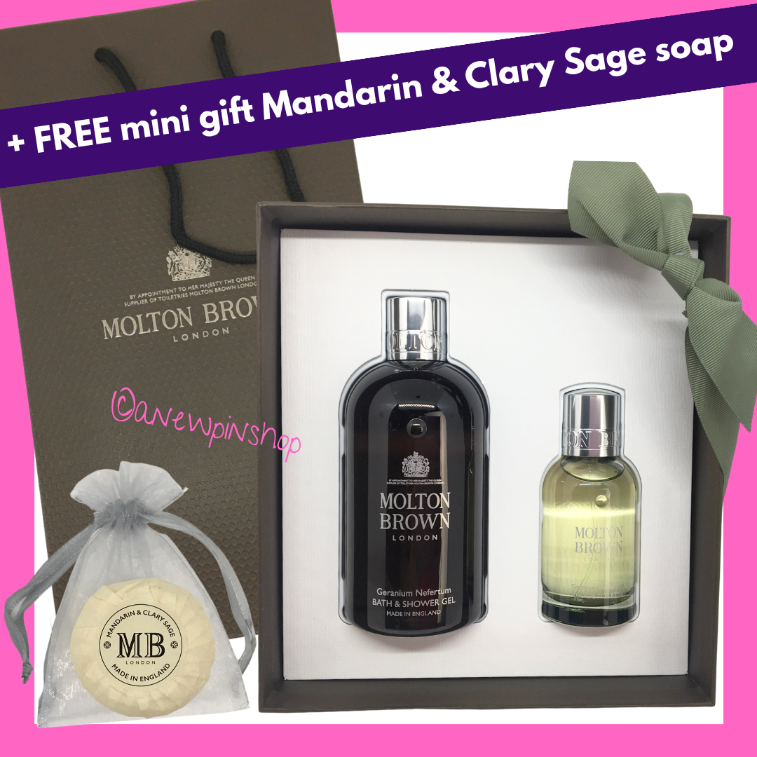 MOLTON BROWN Geranium Nefertum Bath Gel 300ml + EDT 50ml Gift Set Box + Bag