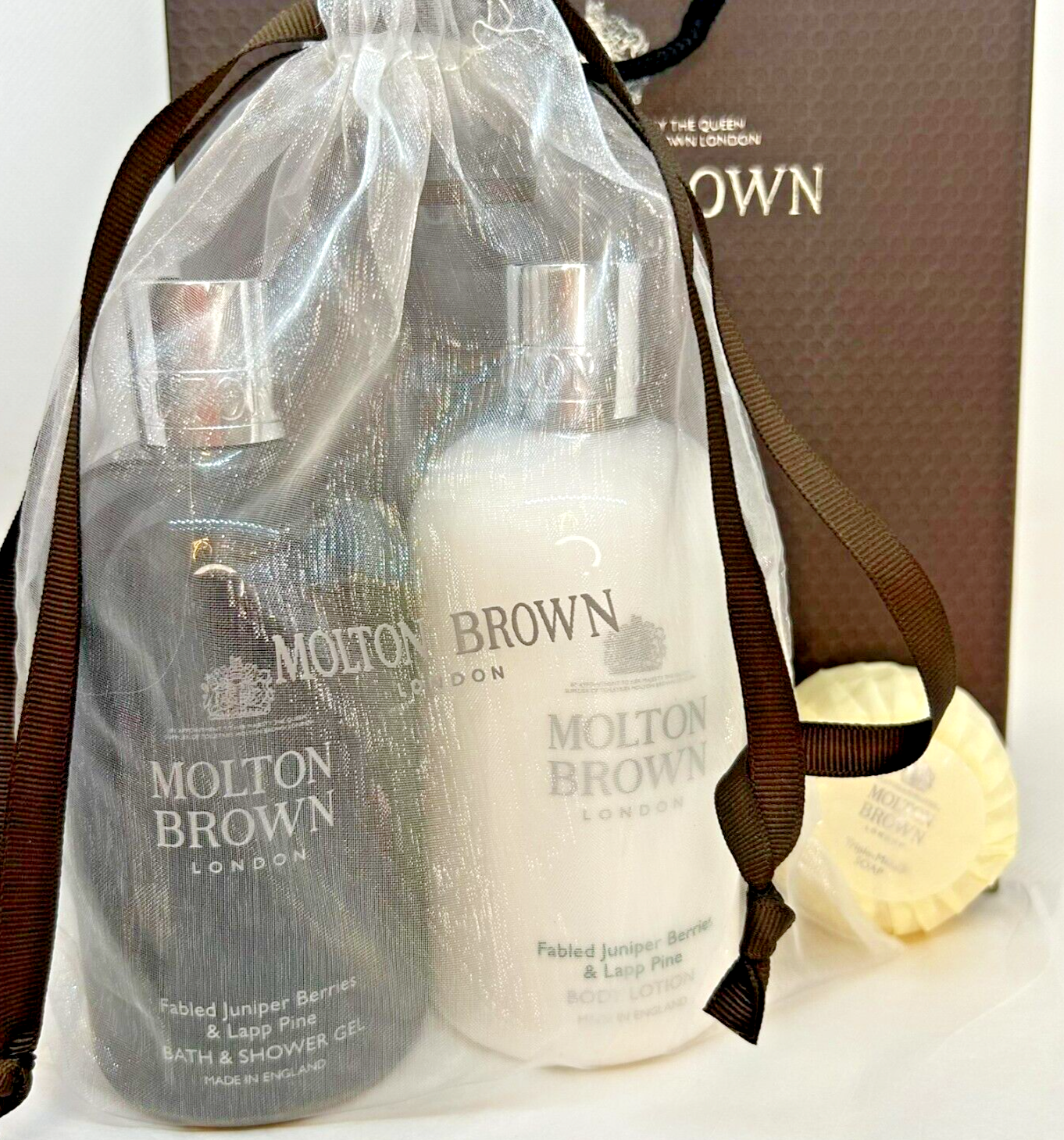 MOLTON BROWN Fabled Juniper & Lapp Pine Bath Gel + Body Lotion Soap Gift Set Bag
