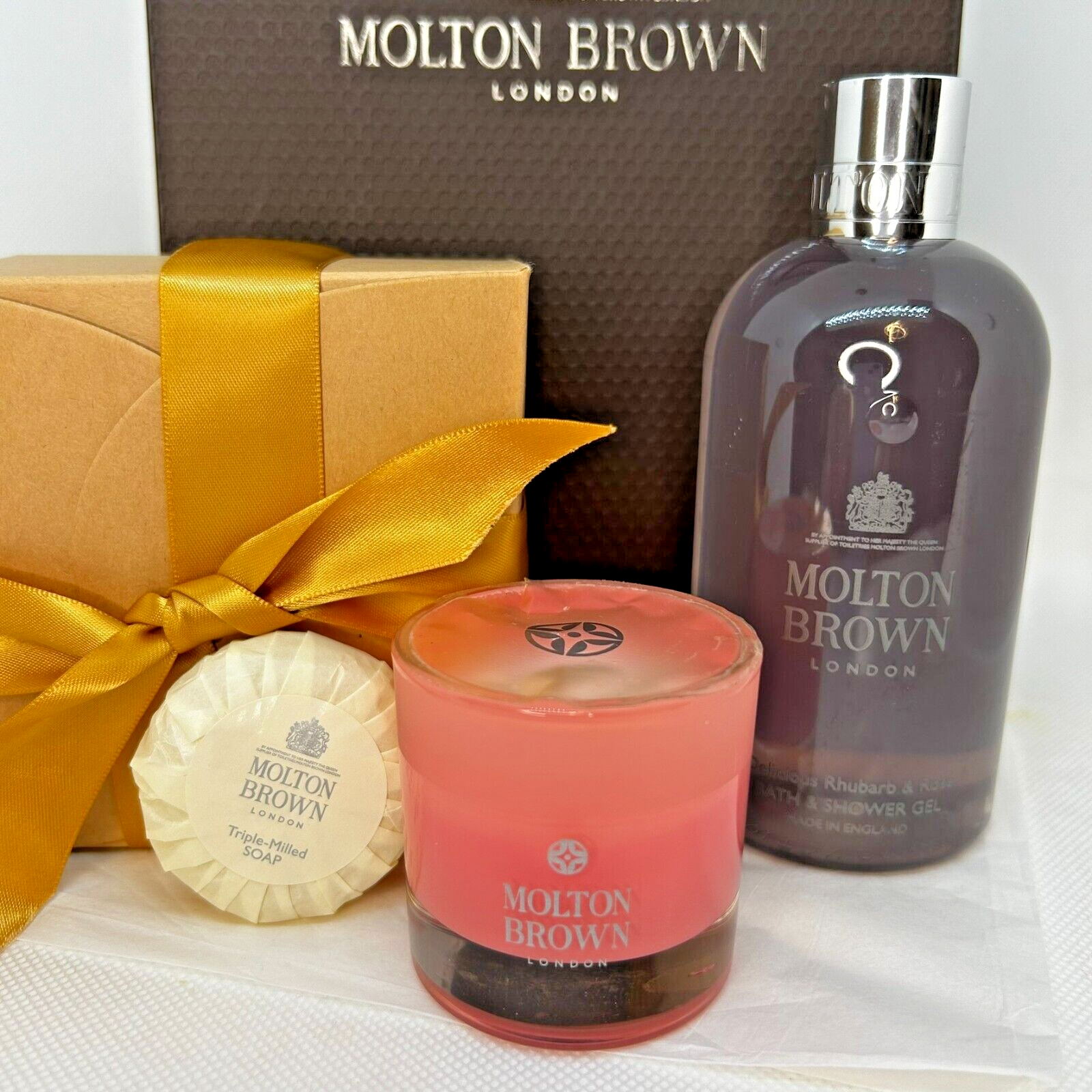 MOLTON BROWN Rose & Rhubarb Bath Shower Gel 300ml Mini Candle Soap Gift Set Bag