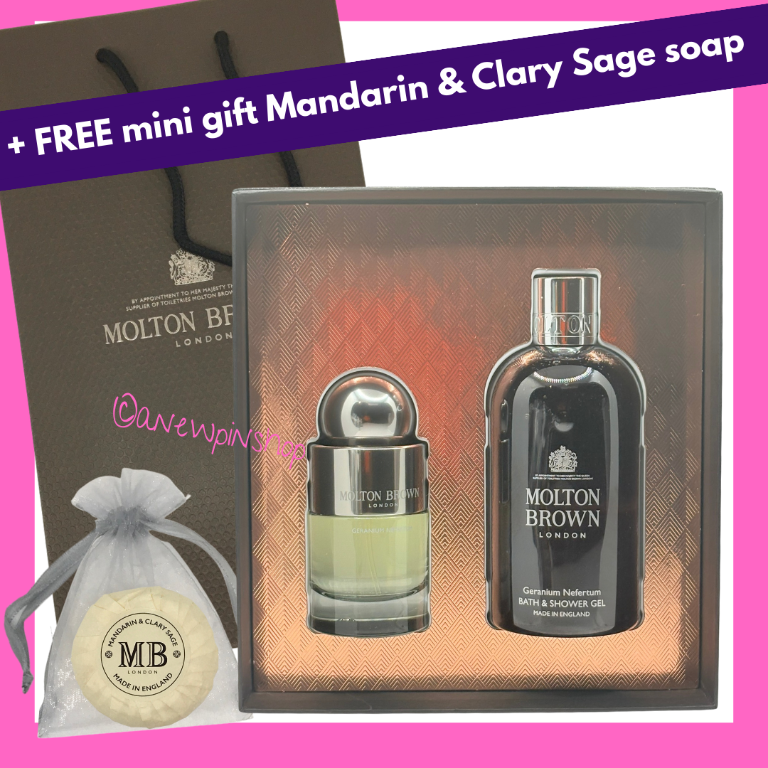 MOLTON BROWN Geranium Nefertum Bath Gel 300ml + EDT 50ml Gift Set Box + Bag