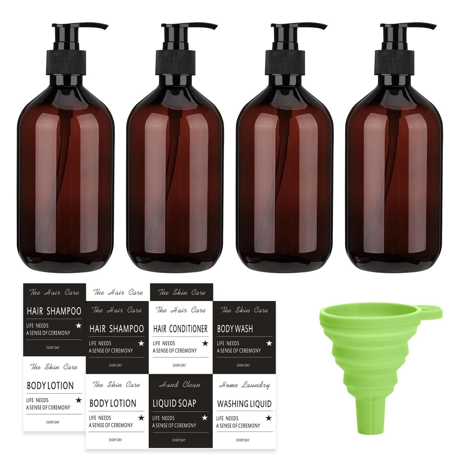 GAOHAN 4 Pack Pump Bottle Dispenser, 500ml Refillable Amber Bottle with Funnel, Pump and Label for Lotions, Shampoo, Conditioner(2 Green+2 Brown)