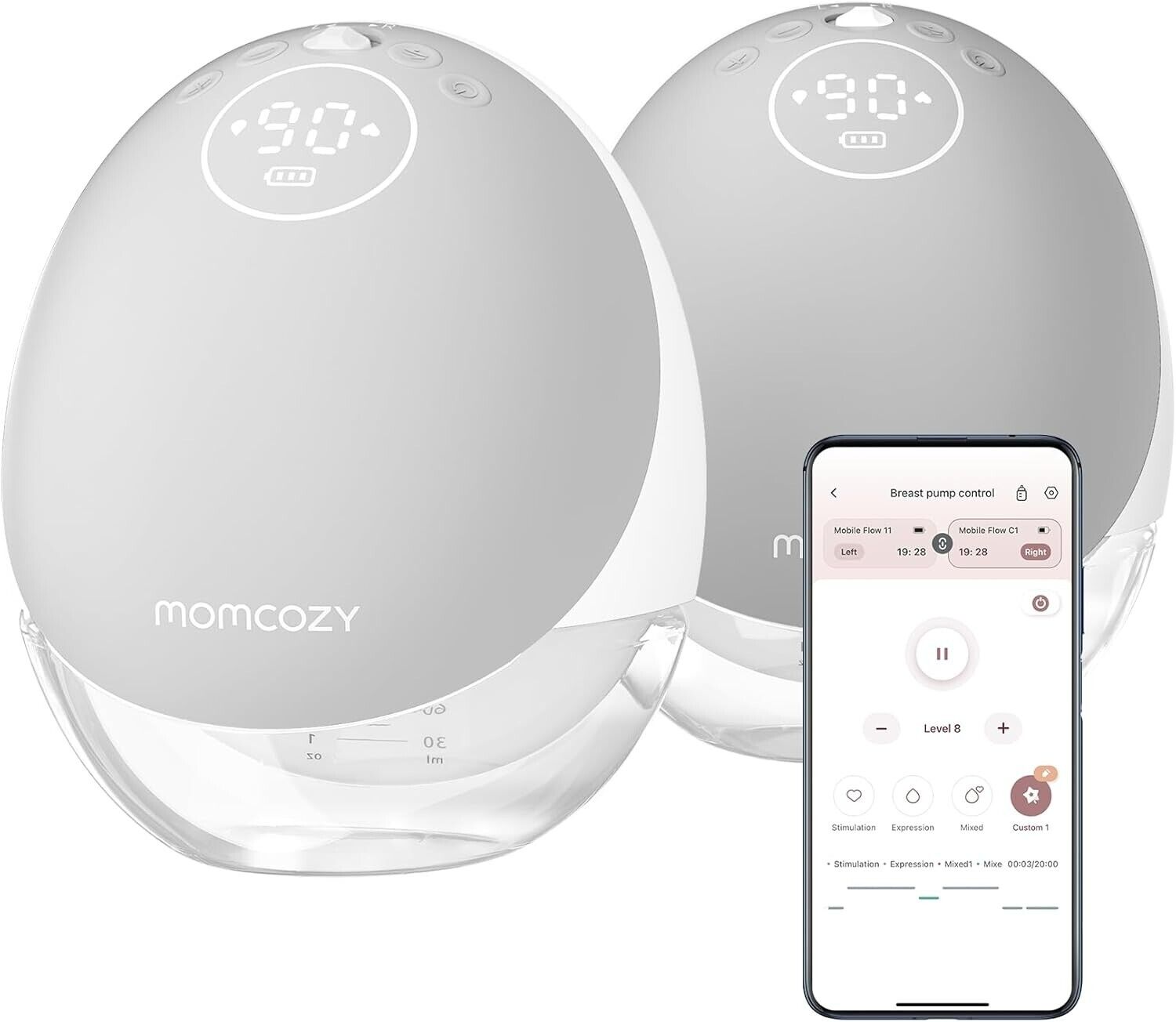 Momcozy Hands Free Breast Pump Mobile Flow | M9 Upgrade, Electric & App Control, Personalized Multi-Modes & 15 Levels, Wearable Pump Breastfeeding, 24mm (Cozy Gray, 2 Count)
