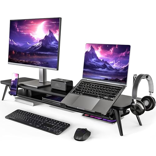 Fenge Monitor Stand Riser for 2 Monitors 108CM Large Computer Monitor Stands with Adjustable Laptop Riser, Desk Organizer with Pad/Headphone Holder, Max Load 50KG (Black)