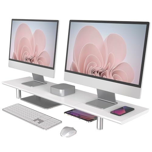 Fenge Dual Monitor Stand Riser with 2 Acrylic Storage Drawer 108cm Large Monitor Stands for PC/Laptop/Fax/Printer/TV Screen, Whole Piece Board, White
