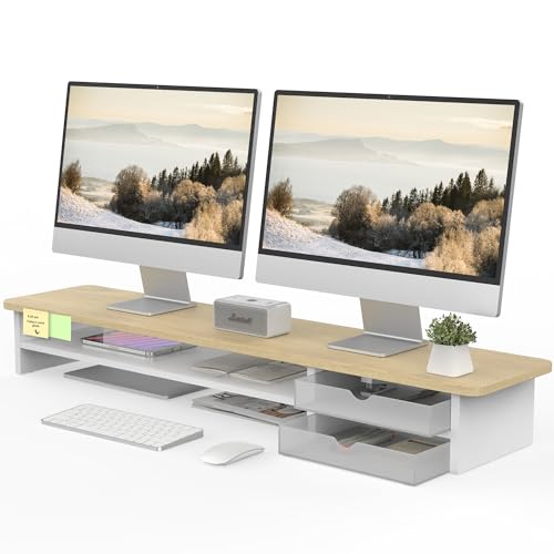 Fenge Dual Monitor Stand Riser with 2 Acrylic Storage Drawer 108cm Large Monitor Stands for PC/Laptop/Fax/Printer/TV Screen, Whole Piece Board, Oak+White
