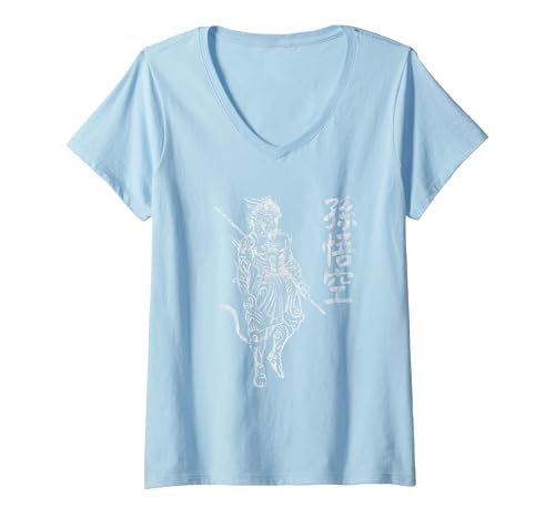 Sun Wukong Monkey King Chinese Characters Letters V-Neck T-Shirt, Women, Baby Blue, L