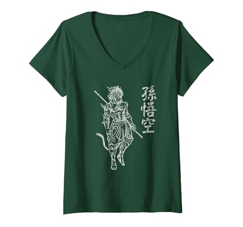 Sun Wukong Monkey King Chinese Characters Letters V-Neck T-Shirt, Women, Forest Green, M