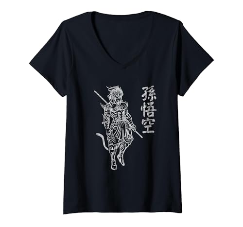 Sun Wukong Monkey King Chinese Characters Letters V-Neck T-Shirt, Women, Black, S