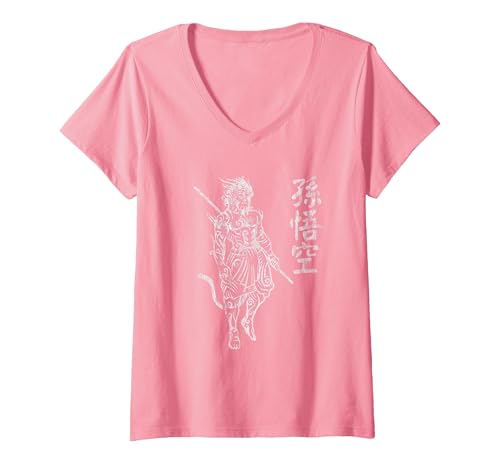 Sun Wukong Monkey King Chinese Characters Letters V-Neck T-Shirt, Women, Pink, M