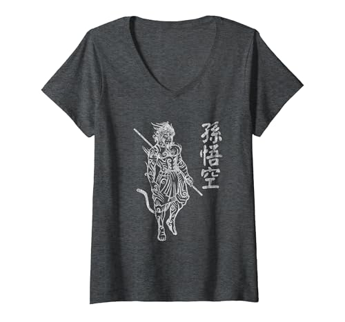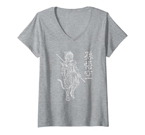 Sun Wukong Monkey King Chinese Characters Letters V-Neck T-Shirt, Women, Heather Grey, M