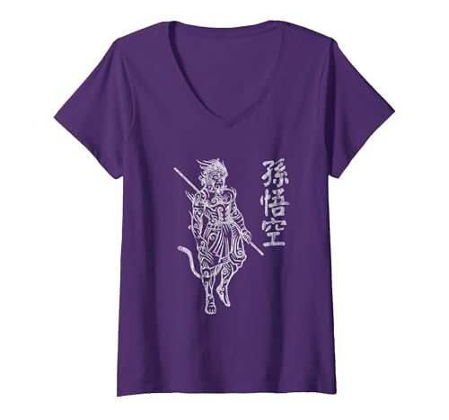 Sun Wukong Monkey King Chinese Characters Letters V-Neck T-Shirt, Women, Purple, XL