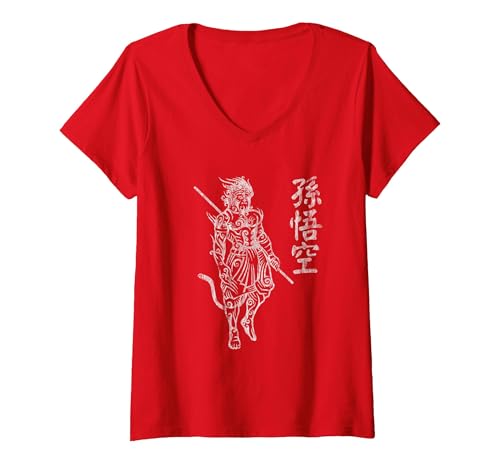 Sun Wukong Monkey King Chinese Characters Letters V-Neck T-Shirt, Women, Red, M