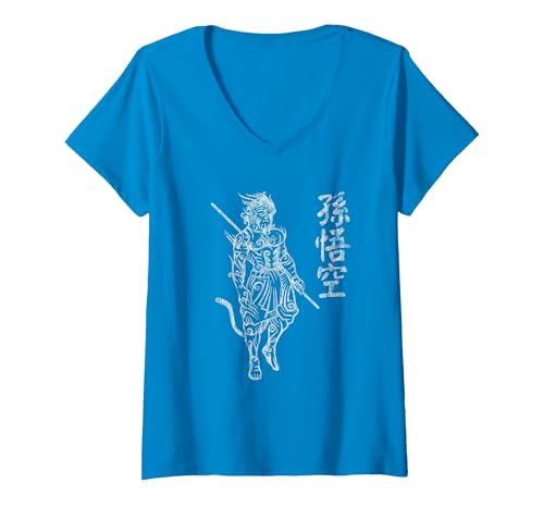 Sun Wukong Monkey King Chinese Characters Letters V-Neck T-Shirt, Women, Sapphire, S